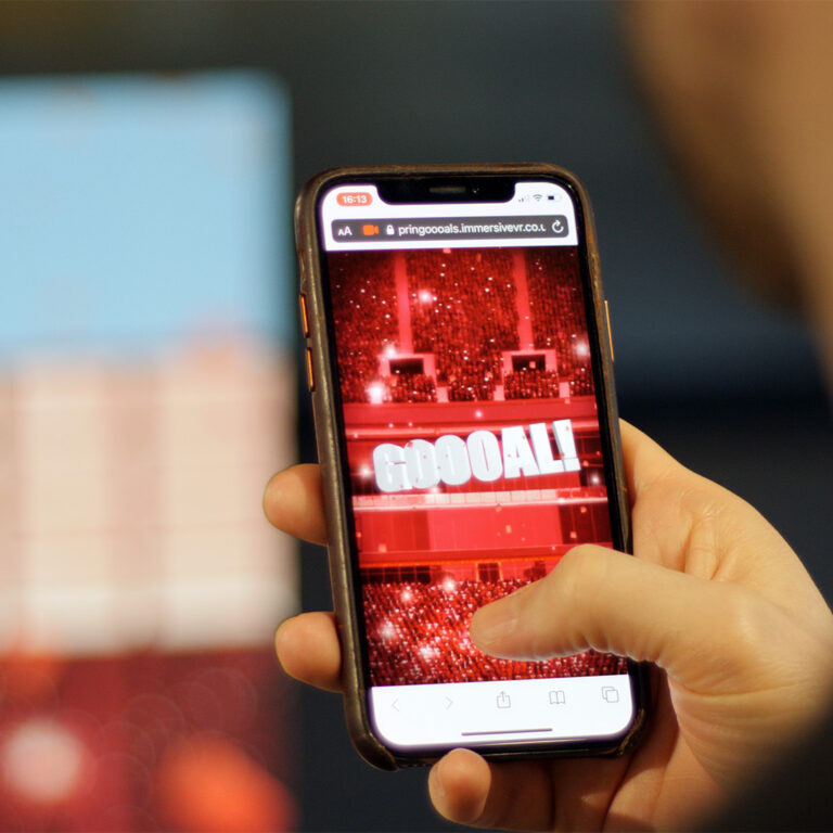We designed and developed the Pringoooals game around two AR markers – a QR code to launch the experience and a tracking marker to anchor the action. Once triggered, players faced off against a Pringles goalie in a penalty shoot–out, with simple screen taps controlling their shot choices. We created and animated a footballer, ball and pitch, complete with celebratory animations – from slides to robot dances – and layered in crowd audio to deliver a stadium atmosphere. At the end, users were prompted with a competition mechanic to win prizes, extending engagement beyond the game.