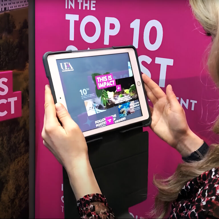 Every year, UEA’s Higher Education advisers attend UCAS fairs across the country to attract new students. Despite the university’s strong academic reputation, many visitors had never heard of UEA or Norwich. Competing with hundreds of other institutions, UEA needed a way to stand out and tell their story within the confined space of an exhibition stand. The challenge was to create something innovative and visually engaging that reflected UEA’s forward-thinking nature, while giving prospective students a real sense of the university’s character and location. The experience also needed to work seamlessly alongside the team’s existing digital setup.