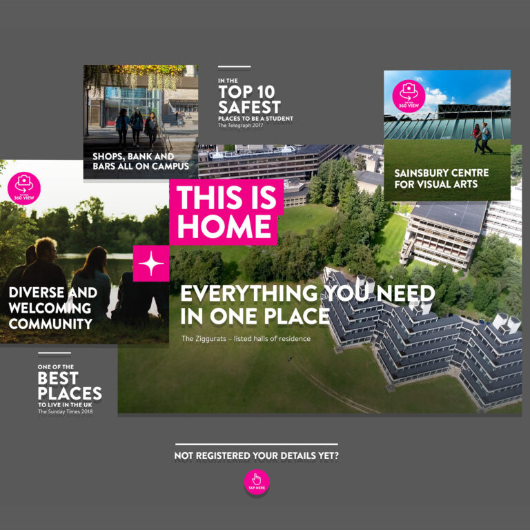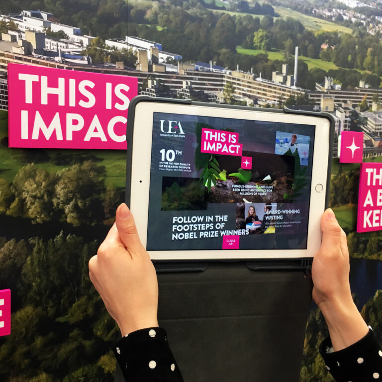 We built an augmented reality app using the stand’s text lock-ups as image markers, designed for the iPads already collecting data. Once students entered their details, they could unlock hidden content simply by scanning the stand graphics. Each marker triggered different content linked to university life – such as research, accommodation or community – through a mix of 360º and 2D videos, images, 3D models and animations. We added depth and interactivity including hidden “easter egg” content for discovery. The app turned the stand into a lively, multi-layered experience that reflected UEA’s innovation and creativity.