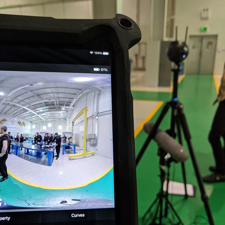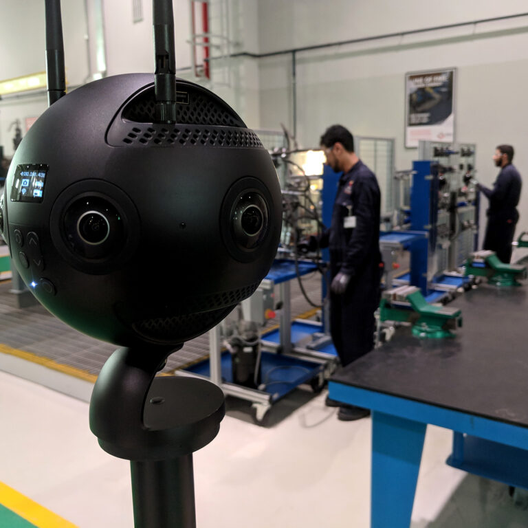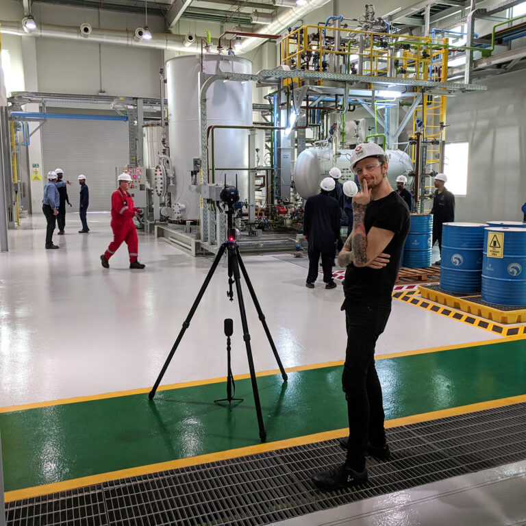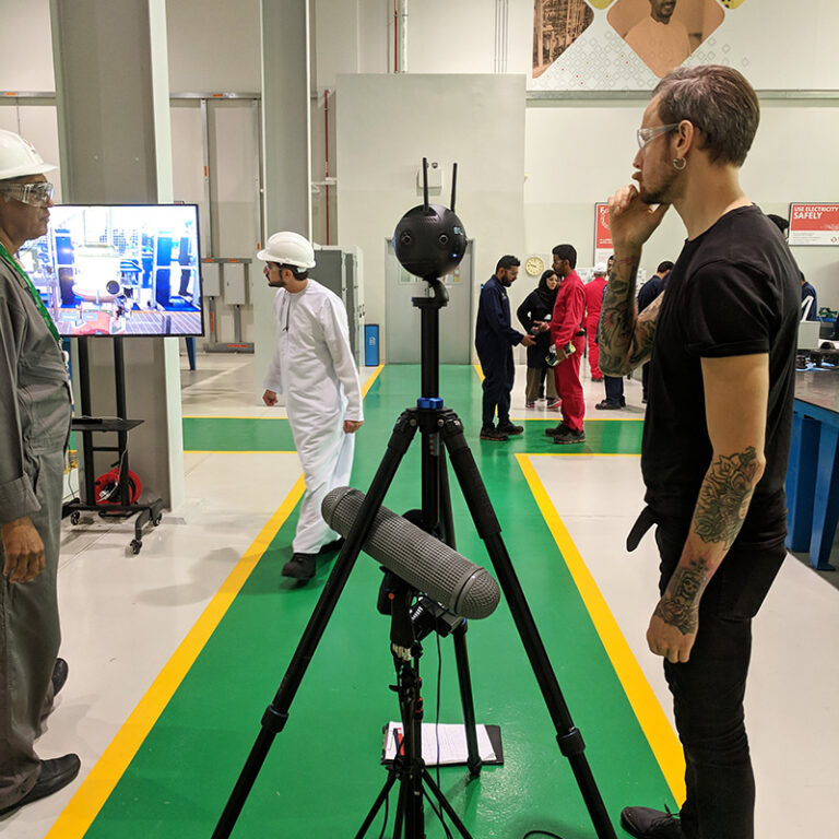 Our crew travelled to Oman to film the facility over three days, capturing a complete walk-through from the perspective of a visiting student or client. Subject matter experts acted as guides, explaining both the practical and classroom-based aspects of training. To emphasise the centre’s scale, we filmed in stereo 360º – enabling viewers to fully appreciate the depth of the replica rigs and workshops. The finished tour was loaded onto Pico Goblin headsets for the exhibition, offering an immersive on-stand experience. To maximise reach, the video was also uploaded to YouTube for remote audiences.